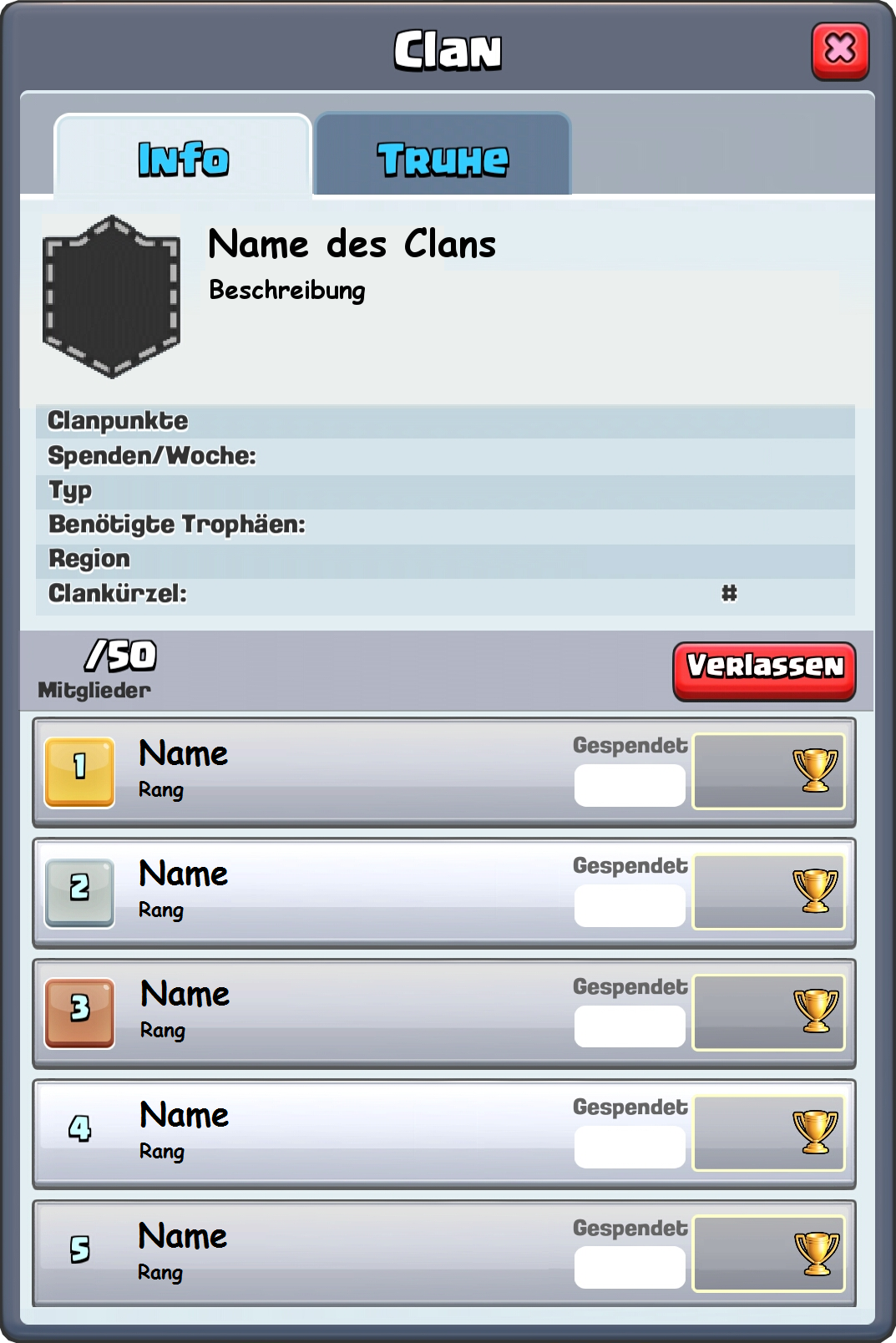 - "Offen": Jeder kann dem Clan beitreten, falls man die passende Anzahl an Trophäen hat.