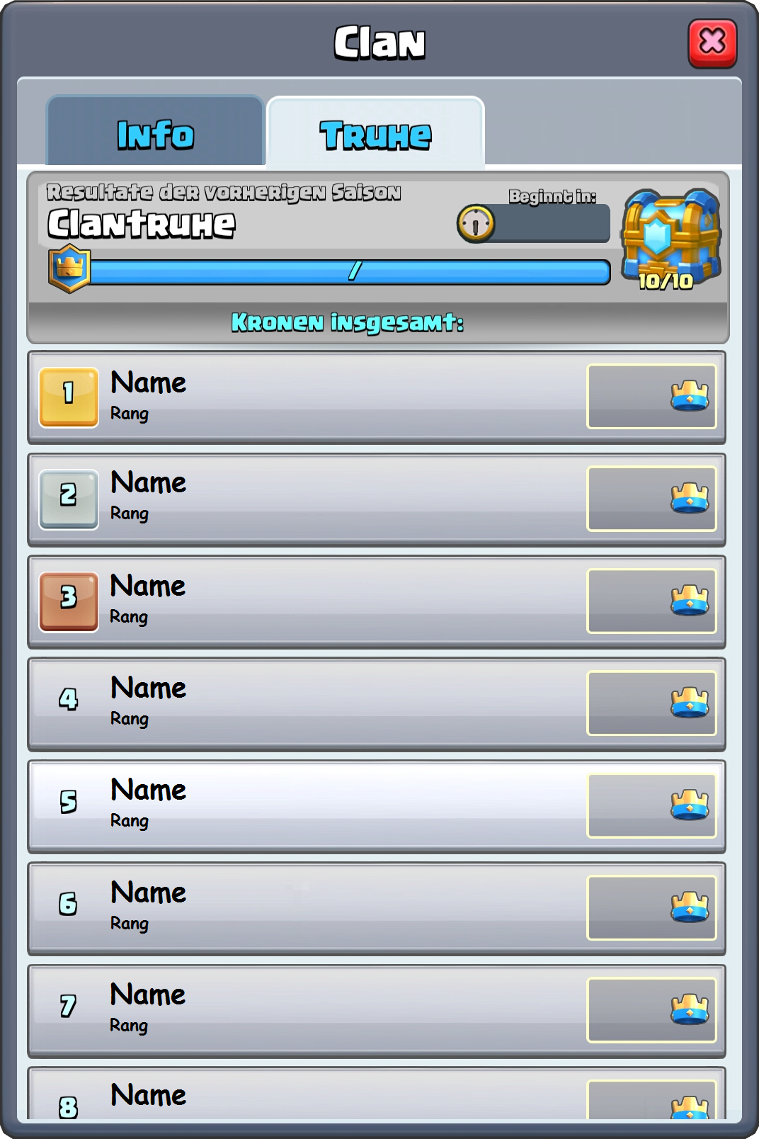 - Wenn man null Kronen gesammelt hat, aus dem Clan austritt oder hinausgeworfen wird, bekommt man keine Clantruhe.
