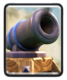 The Cannon is a Common card that is unlocked from the Barbarian Bowl (Arena 3). It spawns a single-target, ground-targeting, medium-ranged, building with moderate hitpoints and moderate damage. It appears as a large dark metal barrel mounted on a four-legged wooden mount with a metal plate and a crude, with two team-colored ridges, one midway and the other at the rear. A Cannon card costs 3 Elixir to deploy.