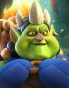 Goblin for each enemy defeated. The Goblin Queen takes the appearance of a large Goblin with braided hair, reddish pointy nose and puffy eyes, and wears a team-colored gown with three golden rings attached and a tan loincloth, a light brown belt with a pouch attached, a golden earring, two small golden rings, and a crown, while carrying a wooden staff with two large horns on top, a large golden ball on the front supported with multiple smaller variants, and three ropes tied to it. Her animation when selected has her walking from the middle-left of the screen, then spinning 360º clockwise in the middle of the screen, and then lifting and stomping her staff on the ground.