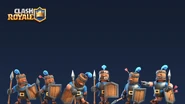 The Royal Recruits is a Common card that is unlocked from the Royal Arena (Arena 7). It spawns six single-target, ground-targeting, melee, ground troops with moderate hitpoints and moderate damage with shields in addition to their normal hitpoints. Their deployment is in a horizontal formation spanning the Arena. They appear as men with large, round noses, wear wooden buckets with team-colored feathers, which cover their faces, metal gloves, an armor, a chain mail, a team-colored shirt and belt, and brown sandals, and wield spears and wooden shields. They are also the same as that spawned by the Royal Delivery. A Royal Recruits card costs 7 Elixir to deploy.